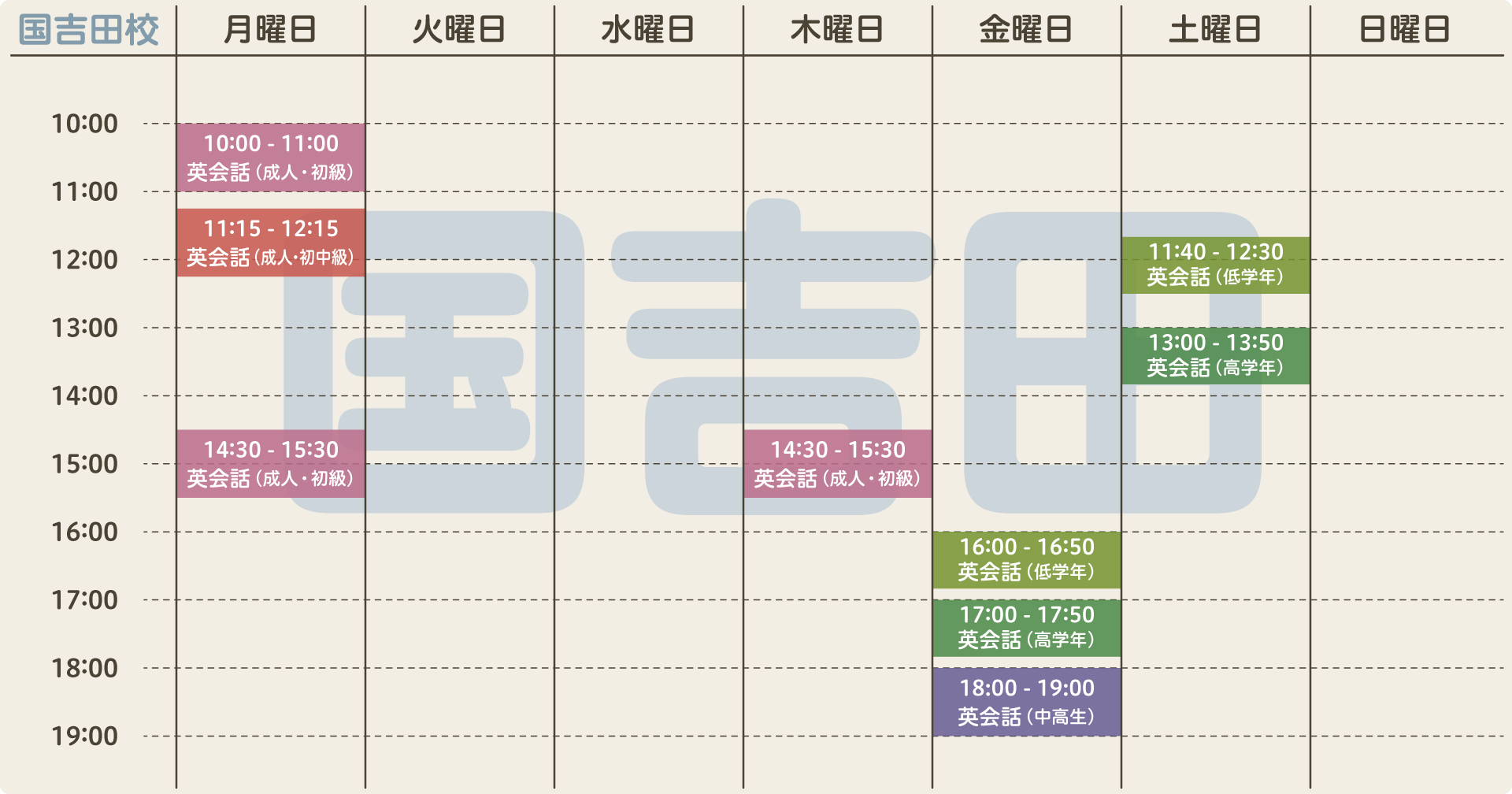 『英会話』クラスには、大きく分けて大人(成人)向けと、子ども(小学生・中高生)向けのレッスンがあり、それぞれのレベルや目的に合わせて安心してスタートできるカリキュラムが設けられています。平日昼間から夕方、週末まで曜日や時間帯も幅広く設定しているため、ライフスタイルに合わせて無理なく通っていただけるのも魅力です。